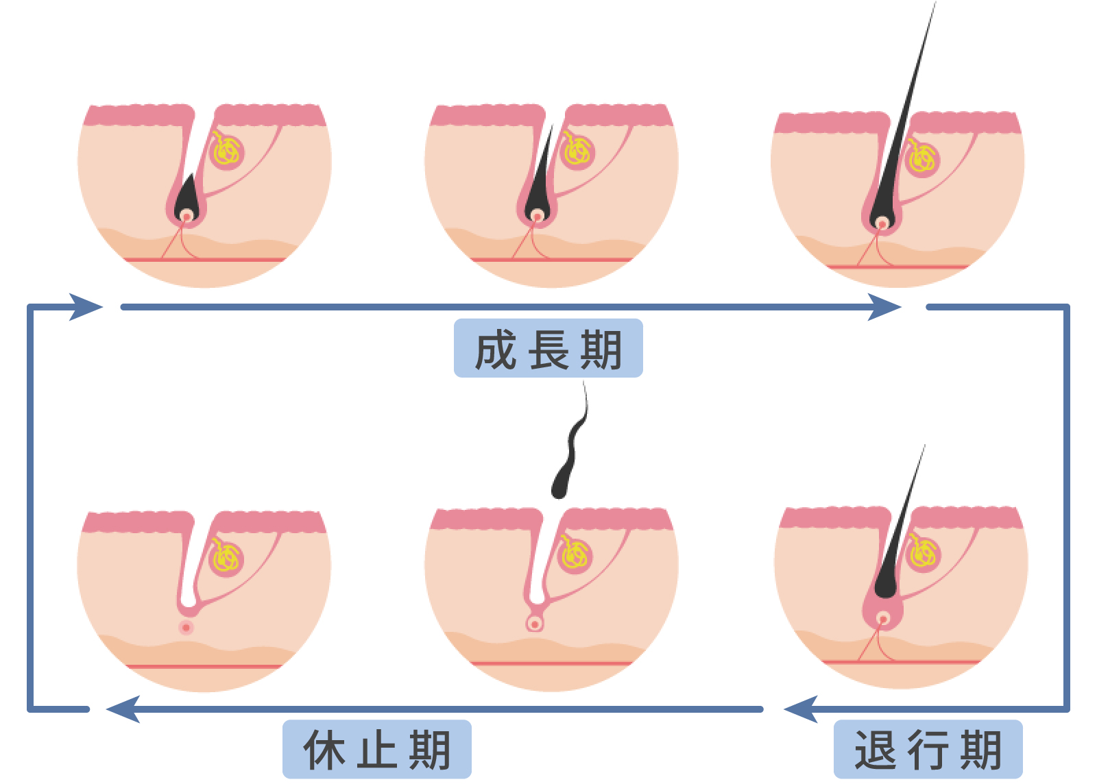 毛には毛周期(もうしゅうき)があり、毛周期とは、毛の生えかわりのサイクルのことを指します。人間の毛髪は頭皮や体毛などで異なる周期を持ちますが、一般的には以下の3つの段階に分かれます。